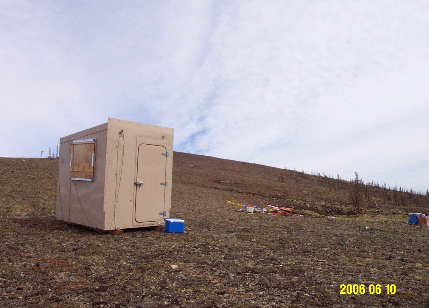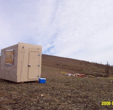 This fiberglass building would provide hard shelter for two and provide power and a place to store supplies while we worked on the other cabins.